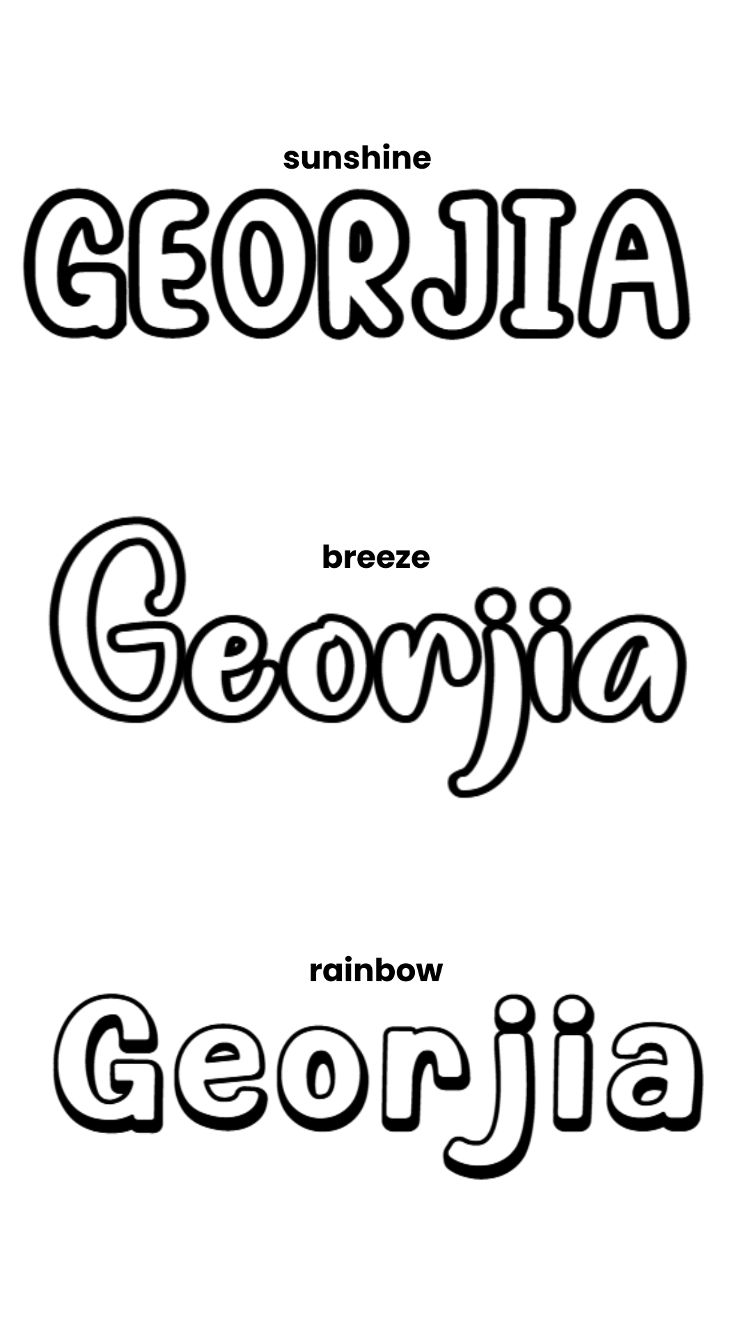 Each outline is wide enough to colour in easily, and you can use up to 12 characters for your name.